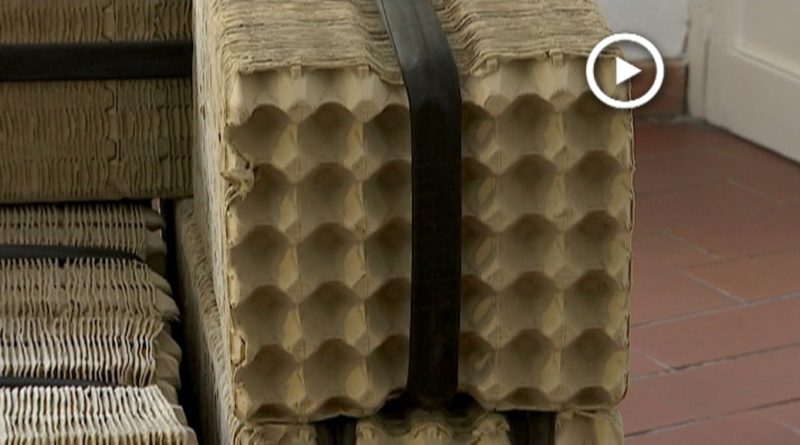 Les oueres de cartró poden tenir una utilitat diferent. Es el cas d’aquest sofà, que s’ha fet amb aquest material. Un element que forma part de l’exposició ‘Upcycling’ on totes les obres estan fetes amb materials reciclats. Els quatres autors, a través de les peces, volen fer reflexionar als visitants sobre com utilitzem els recursos del planeta.