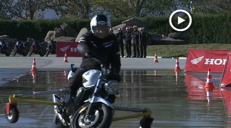 Aquest exercici de frenada sobre l’asfalt mullat amb una motocicleta sense ABS, i un altre amb l’ABS activat és un dels exercicis de Seguretat i conducció de motocicletes, que s’imparteixen en els cursos de l’Honda Institut de Seguretat (HIS)