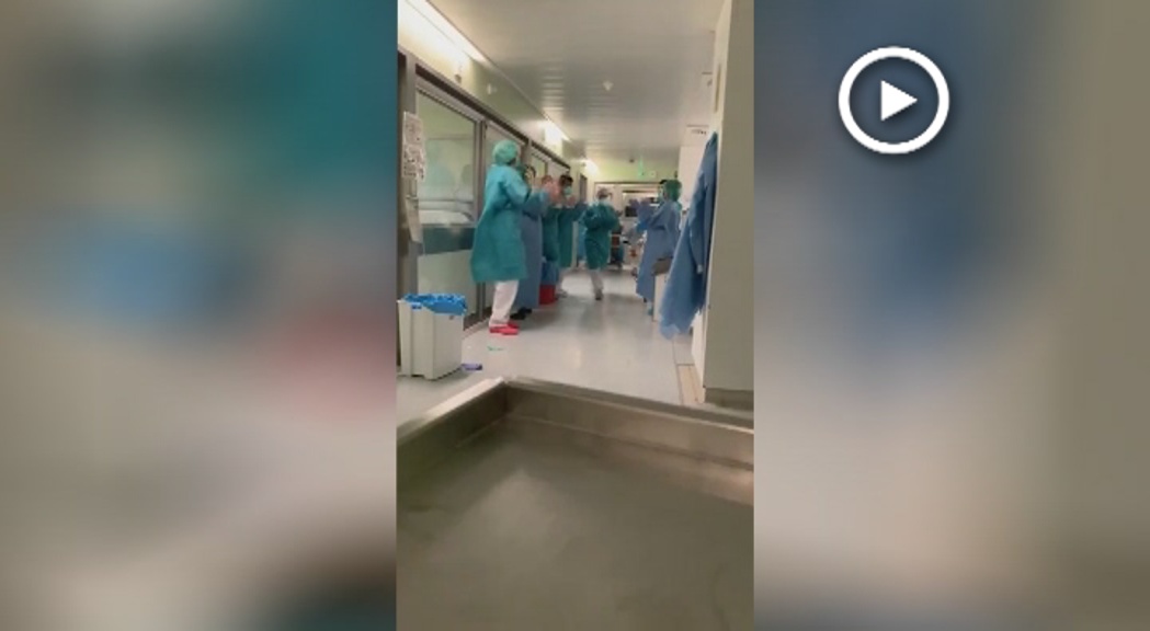 El personal de l’Hospital de Granollers celebra amb aplaudiments la sortida del primer pacient per coronavirus de la UCI