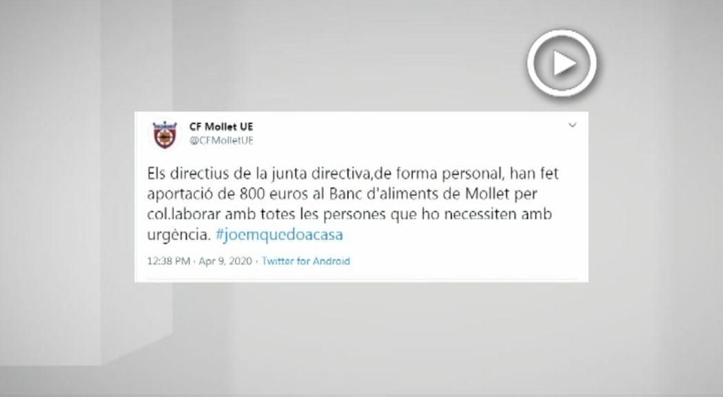 El CF Mollet UE també s’ha sumat a les donacions a aquells sectors que més suport necessiten aquests dies. Segons han publicat al seu compte de Twitter han donat 800 euros al Banc d’Aliments de Mollet. Ho han fet tots els directius de la junta de forma conjunta.
