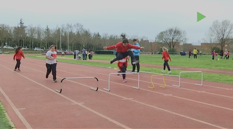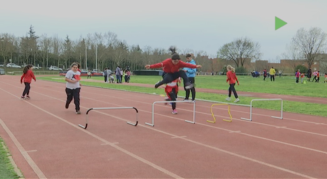 300 escolars de 4art de primaria han compartit l’espai de la pista municipal La Pedra Salvadora en aquesta jornada dedicada a l’atletisme, a partir de jocs d’iniciació i diferents proves atlètiques com aquesta de salt d’obstacles.