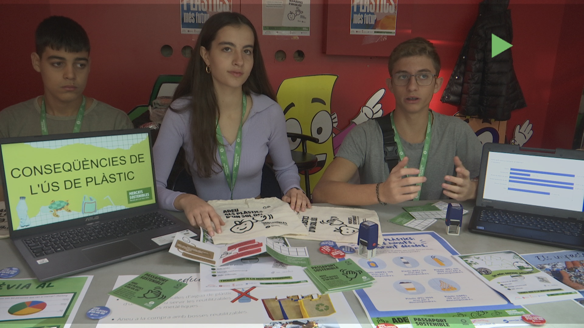Ubicats en aquesta parada del Mercat Municipal de Mollet, els alumnes de tercer i quart art d’ESO de l’escola Anselm Clavé intenten conscienciar als ciutadans de la importància de reduir els plàstics d’un sol ús en les seves compres al mercat. Els estudiants també fan difusió de la campanya “Mercats Sostenibles. Adeu als plàstics d’un sol ús” buscant possibles compradors i oferint-los aquest passaport.