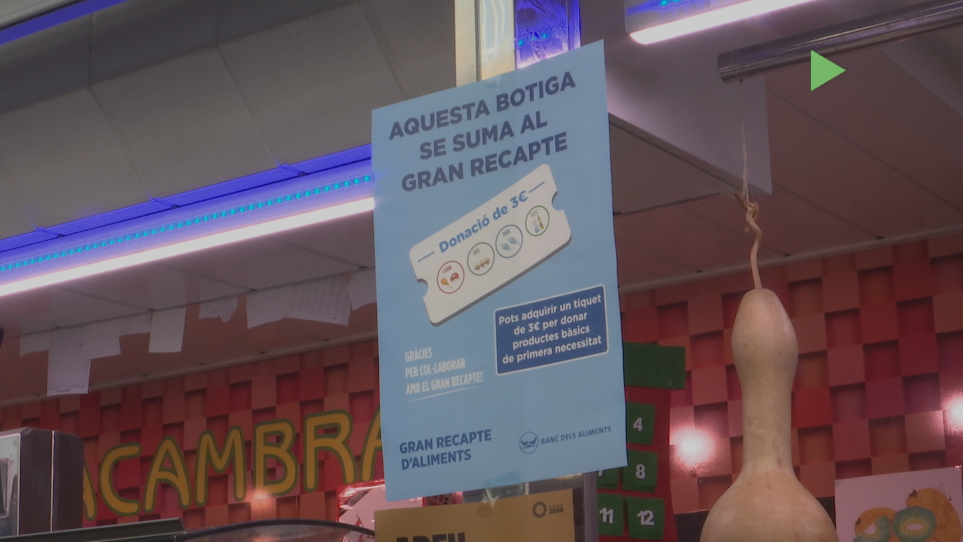 El cartell blau identifica aquelles parades del mercat municipal de Mollet que s’han adherit a la campanya del Gran Recapte. Aquesta és la tercera vegada que els negocis participen en aquesta iniciativa solidària, que enguany s’allarga una setmana més del que és habitual. Per tant, els donatius es podran fer fins al dia 3 de desembre.