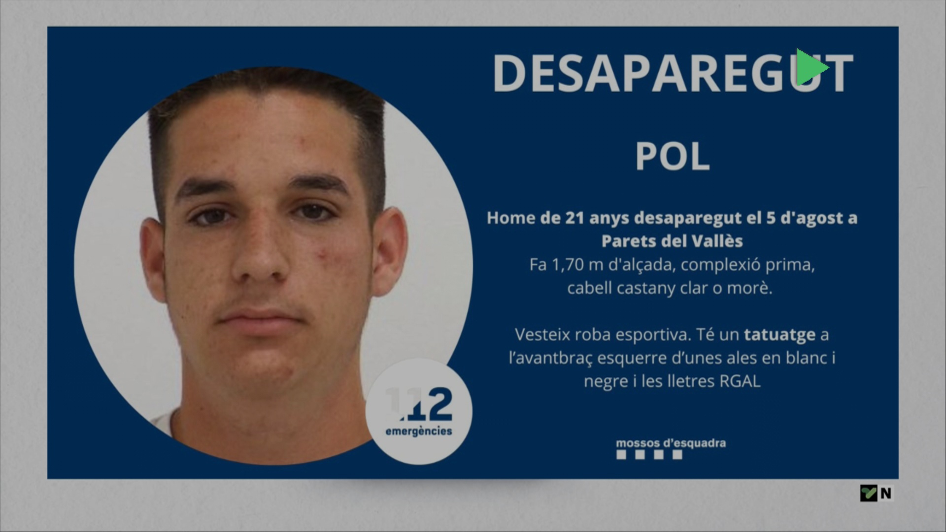 Els Mossos també informen que vesteix roba esportiva, té un tatuatge a l’avantbraç esquerre d’unes ales en blanc i negre i les lletres RGAL.