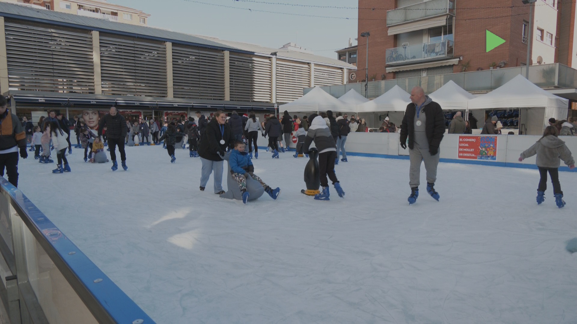 Desenes d’infants han omplert els 350 metres quadrats de la pista de gel de la plaça major de Mollet. En períodes de 30 minuts, petits i grans poden gaudir del patinatge sobre gel, una activitat que és més difícil del que sembla. Però amb una mica de pràctica es van aconseguint bons resultats.