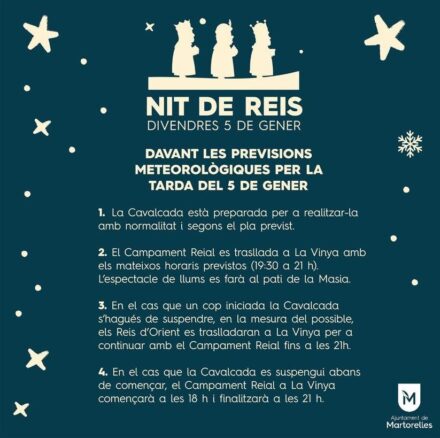 L’Ajuntament de Martorelles informa que la Calvalcada es farà tal com s’havia previst. El Campament Reial es trasllada a La Vinya de 19:30h a 21h. Si s’ha de suspendre la Cavalcada, els Reis es traslladaran a La Vinya.