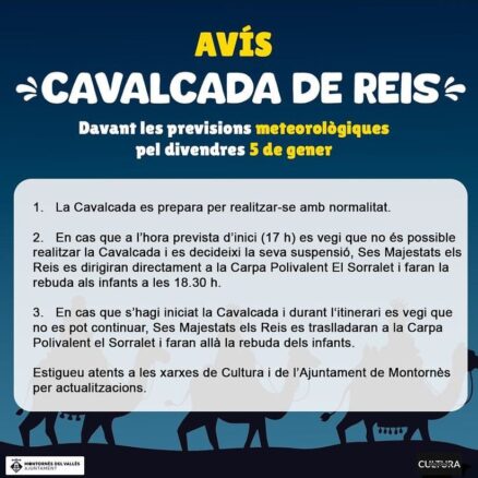 L’Ajuntament de Montornès informa hores d’ara que la Cavalcada es realitzarà tal com s’havia previst. En cas que a les 17h comencin les pluges i sigui possible realitzar la Cavalcada, Ses Majestats es dirigiran directament al Sorralet, fent la rebuda als infants a les 18:30h.