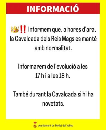 L’Ajuntament de Mollet informa que la seva Cavalcada de Reis es manté amb normalitat. Tot i això, entre les 17h i 18h de la tarda informaran de l’evolució a causa de l’estat de les pluges.