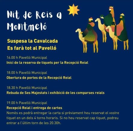 L’Ajuntament de Montmeló informa que la Cavalcada ha quedat suspesa. En aquest cas, a les 16h s’iniciarà la reserva de tiquets per assistir a la Recepció Reial al Pavelló Municipal. A les 18h s’obriran les portes del Pavelló i mitja hora més tard es rebrà a Ses Majestats.