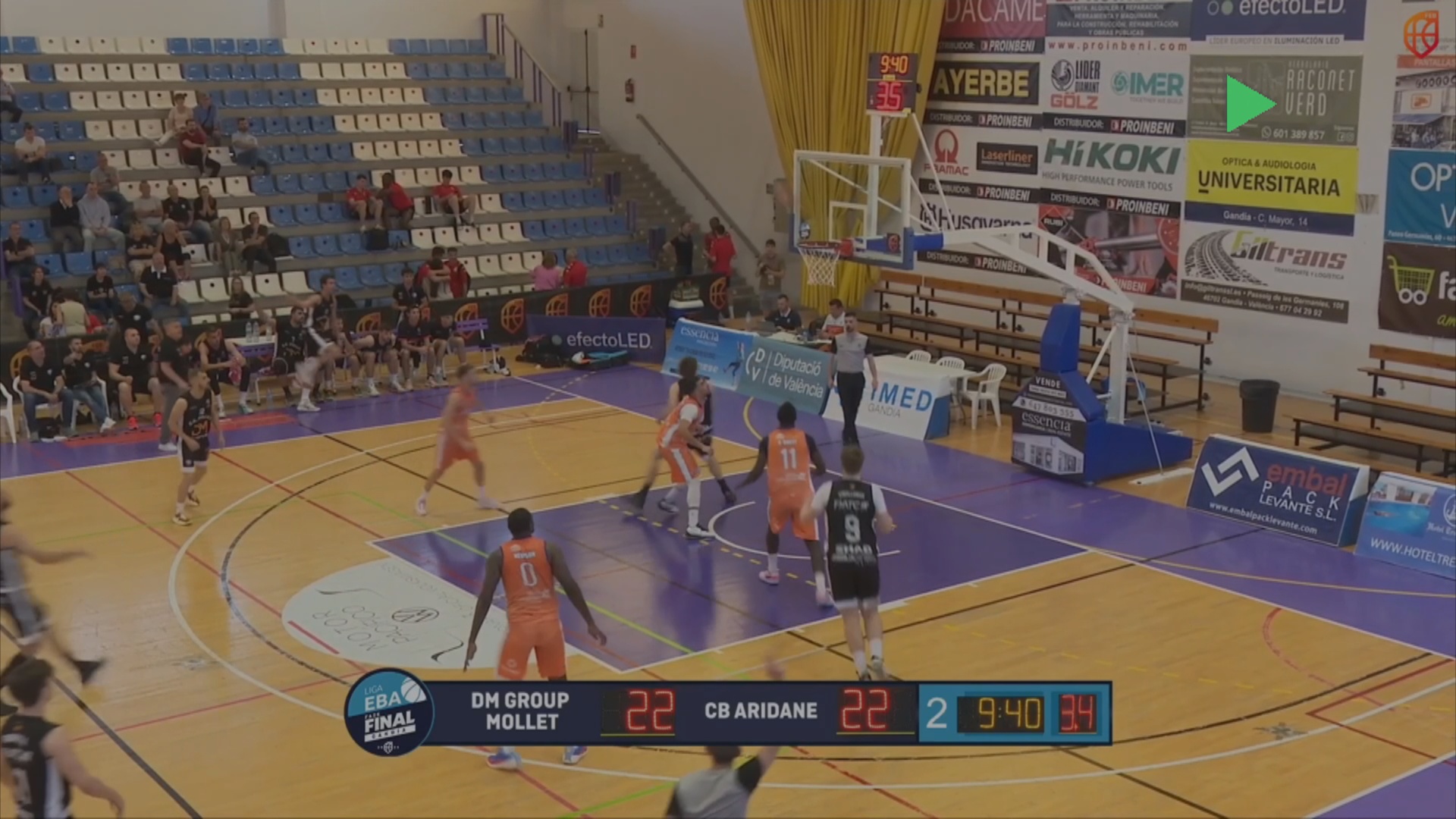 Amb dos triples només començar, l’Aridane ha donat mostres del seu potencial des del tir exterior. L’equip canari ha acabat signant un 33% d’encert en triples, que contrasta amb un baix 23% dels molletans. Després d’un parcial de 2 a 6, la resposta molletana ha estat d’un 6 a 0 que els ha permès posar-se per davant. Cap dels dos equips aconseguia diferències clares i quan un anotava la resposta no es feia esperar. Amb el 19 a 22, un triple de Nacho Marín posava l’equilibri en acabar el primer quart. El segon ha començat amb un triple de Marc Blanch, però un parcial de 2 a 9 ha permès a l’Aridane escapar-se de 4. Al descans s’hi ha arribat amb el 38 a 42.