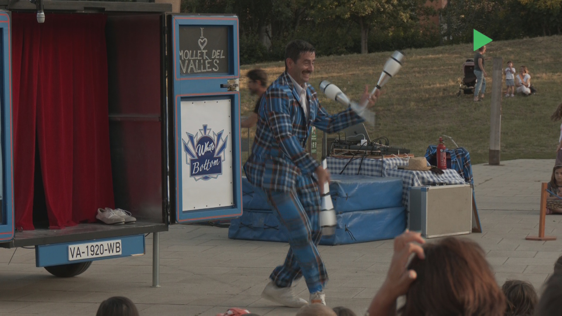 Els malabars han estat una de les modalitats que s’han pogut veure en l’espectacle que Ramiro Vergaz ha portat al parc de les Pruneres. Amb l’humor com a fil conductor, mostra la felicitat d’un personatge quan s’adona que es troba als anys 20, just un segle després. Una proposta que ha anomenat ‘White Bottom‘, que va estrenar fa 3 anys i que ja ha passat per moltes places del país.