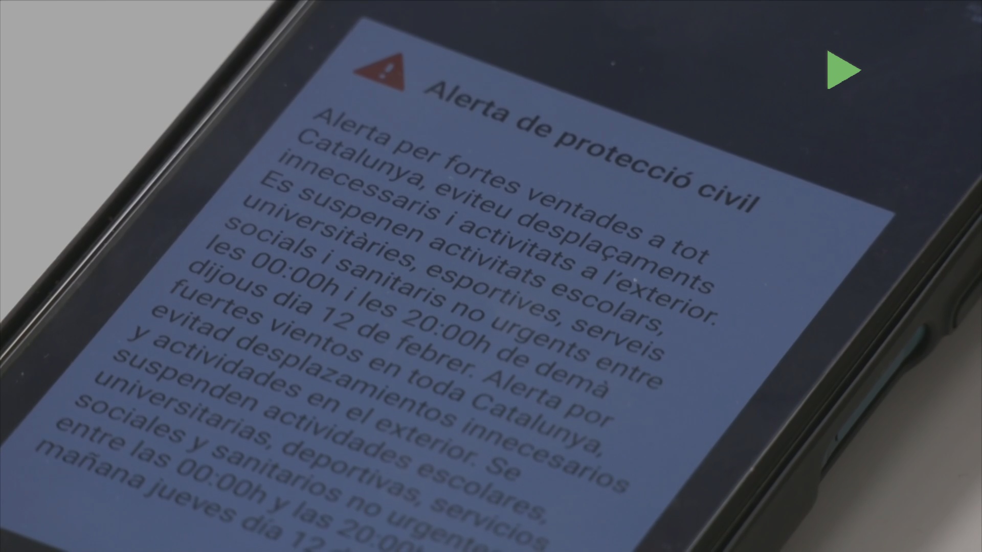 Davant la previsió de ventades amb perill extrem per aquest dijous, 12 de febrer, a gran part de Catalunya, Protecció Civil ha enviat aquesta tarda un Es-Alert a la població demanant molta precaució i limitar les activitats a l’exterior. Aquesta és la primera vegada que s’ha utilitzat aquesta eina per fortes ventades. Davant del risc que es preveu per a demà dijous, tota l’activitat educativa, universitària, així com les activitats sanitàries no urgents, s’han suspès des d’aquesta mitjanit fins demà a les 8 del vespre. També s’atura la pràctica esportiva a l’exterior i s’insta a evitar els desplaçaments i fer teletreball. El fort temporal de vent de ponent previst per a les pròximes hores també ha fet que els ajuntaments del Baix Vallès prenguin algunes mesures de seguretat com Mollet, que avui mateix ja ha tancat els parcs municipals.